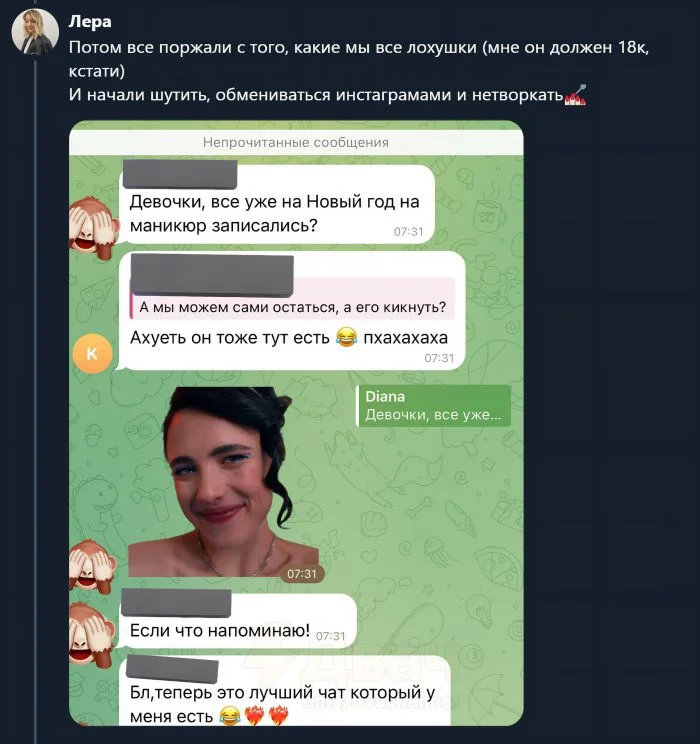 Историей поделилась одна из жертв «очень красивого, двухметрового, модного» мужчины по имени Олег. Причину, по которой он создал общий чат под названием «girls» с бывшими неизвестна, но девушки быстро сориентировались, что к чему, когда увидели, что в чате присутствует только один мужчина, которого все прекрасно знают.