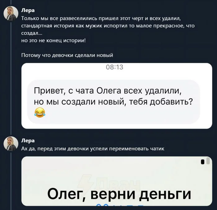 В ходе дальнейшего «расследования» девушки выяснили, что «Казанова» встречался с несколькими девушками одновременно. Тут появился Олег, который протрезвел и осознал, что натворил. Он спешно удалил чат, но было уже поздно, его бывшим настолько понравилось общаться, что они отыскали друг друга и создали новый чат под названием «Олег, верни деньги».
