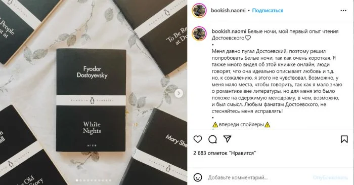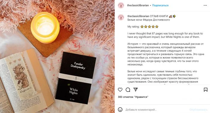 Многие буктокеры сходятся во мнении, что секрет успеха «Белых ночей» кроется в их компактности. Это произведение небольшое по объёму, но производит сильное впечатление. К тому же это отличный способ похвастаться, что читал Достоевского, не погружаясь в его огромные романы на тысячу страниц. Всего 80 с лишним страниц, и ты — ценитель русской классики.