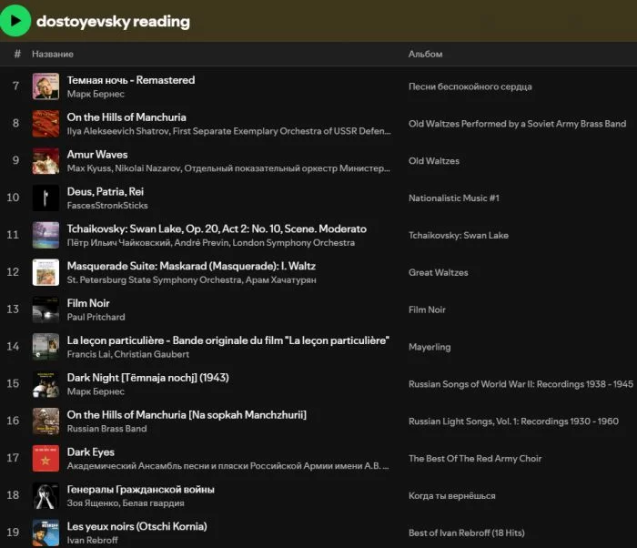 Для усиления атмосферы создаются специальные плейлисты на Spotify. Там, наряду с романтическими балладами мировых исполнителей, можно найти произведения Чайковского, Хачатуряна и песни советской эстрады.