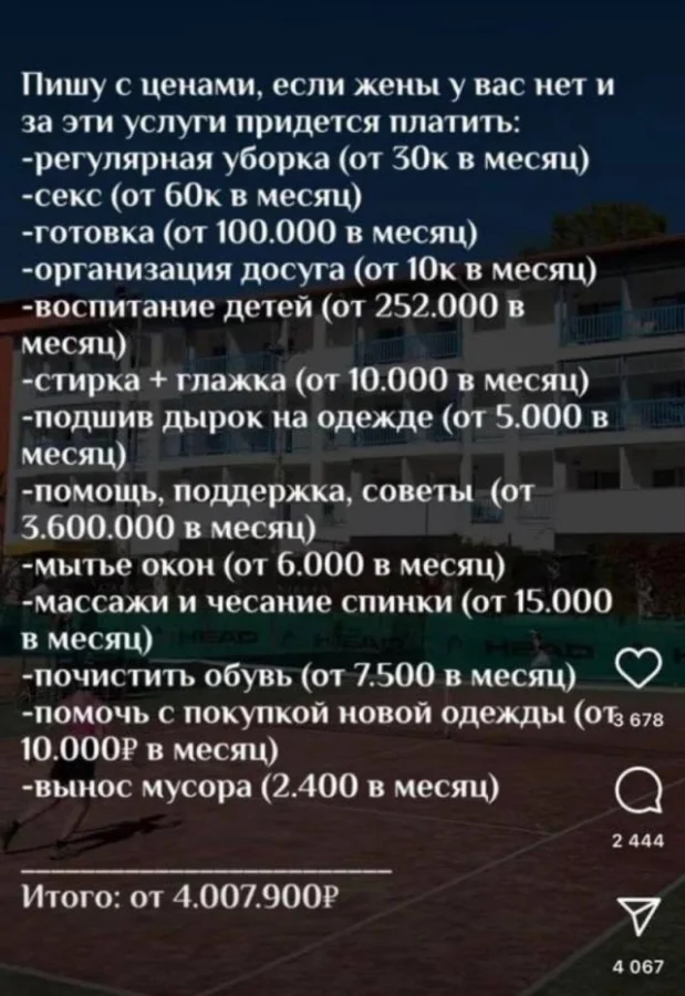 Благодаря ей муж не тратится на еду, секс, уборку, массаж и чесание спинки. Самый дорогой пункт — уникальные советы, которые стоят минимум 3,6 млн в месяц!