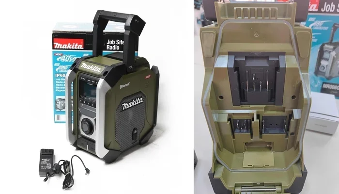 Аккумуляторный Bluetooth радиоприемник Makita работает в AM и FM диапазонах. В нижней части есть низкочастотный динамик для более качественного и глубокого звука. Возможность подключения телефона через Blutooth. Встроенный эквалайзер с шестью предустановленными станциями и одной позицией с возможностью регулировки. Стоит такое 26 000 руб. Ссылка на неё
