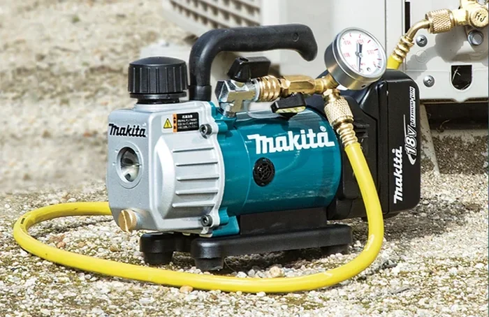 Аккумуляторный вакуумный насос Makita используется при установке систем кондиционирования и предназначен для удаления воздуха из труб хладагента при установке кондиционеров. С помощью насоса путем устранения воздуха из фреоновой магистрали достигается нормальная нагрузка на компрессор и обеспечивается оптимальная хладопроизводительность системы. Оснащен металлическим сетчатым фильтром, предотвращающим попадание масла в выпускное отверстие. Работает от аккумулятора Makita напряжением 18 В, который в комплект не входит и приобретается отдельно. Время работы от аккумулятора емкостью 5 А*ч до 50 минут. Стоит такой около 39 000 руб . Ссылка на него