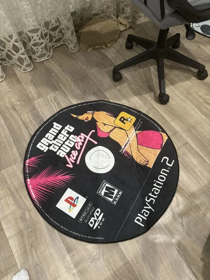 Коврик диаметром 80 см. с игрой GTA Vice City для PS2. Есть также размером побольше. Такой стоит около 1 500 руб . Ссылка на ковёр .