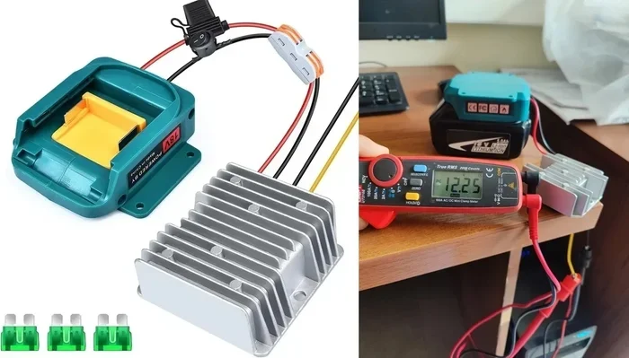 Понижающий адаптер-преобразователь напряжения с 18-20 Вольт от аккумулятора до 12 Вольт постоянного тока на выходе. Также имеет радиатор охлаждения. Стоит такой около 1900 руб. Ссылка на него