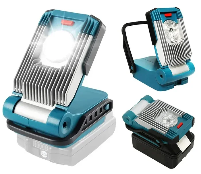 Интересная насадка на аккумуляторные батареи от инструментов Makita напряжением от 14 до 20 Вольт. Сам адаптер сделан в виде прожектора с поворотным механизмом для направления света. Также он имеет выключатель, чтобы не горел всё время. Стоит такой около 700 руб. Ссылка на него