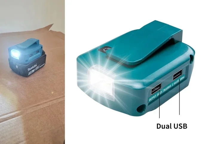Адаптер-переходник на аккумулятор от Makita 18V/20V, который превратит его во внешний аккумулятор (poewrbank) c функцией быстрой зарядки смартфонов и планшетов. На выходах портов 5-12V. Также у него отдельный шнур для зарядки самого акб. Стоит такой 1600 руб. Ссылка на него
