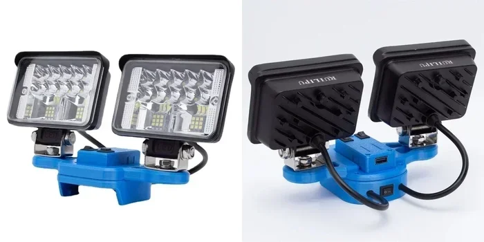 Две внешние поворотные лампы на аккумулятор Makita с USB выходом для быстрой зарядки. Стоит такая 2700 руб. Ссылка на адаптер с прожекторами