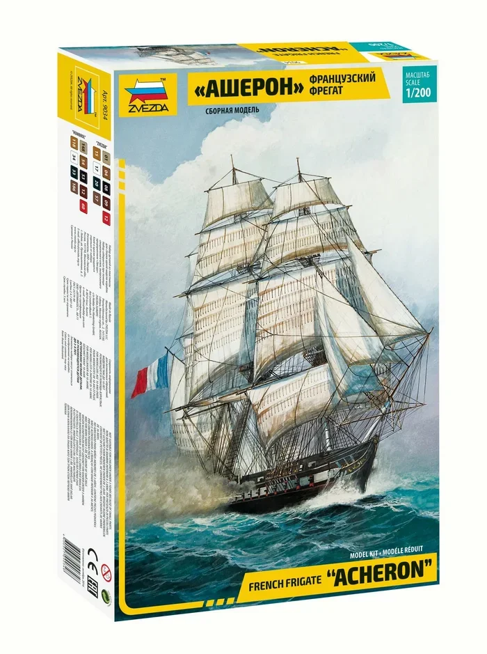 Сборная модель - Французский фрегат "Ашерон" 1:200. Модель легендарного французского фрегата эпохи наполеоновских войн Ашерон, прославившегося активными действиями против английских китобоев и каботажных судов возле берегов Южной Америки и ставшим настоящим кошмаром для британских моряков. Мощное парусное вооружение делало корабль практически неуловимым для кораблей противника, а бортовой залп орудий фрегата буквально сметал все с палубы вражеских кораблей. Ссылка на набор