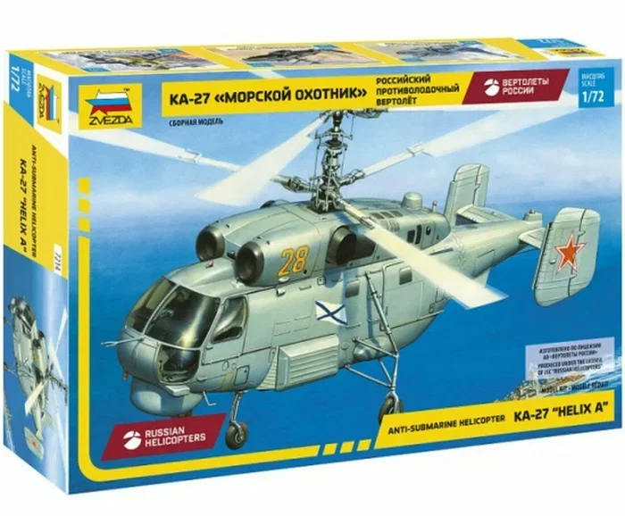 Сборная модель - Российский противолодочный вертолет " Морской охотник". Историческая справка: Советский противолодочный вертолет был создан в КБ им. Камова в конце 70-х годов по заказу ВМФ СССР. Предназначен для поиска и уничтожения подводных лодок и ведения разведки. Приспособлен для посадки и взлета с кораблей ВМФ. Набор деталей из пластмассы для сборки одной модели вертолета. Модель собирается при помощи специального клея, выпускаемого предприятием «Звезда». Краски продаются отдельно от набора. Ссылка на него