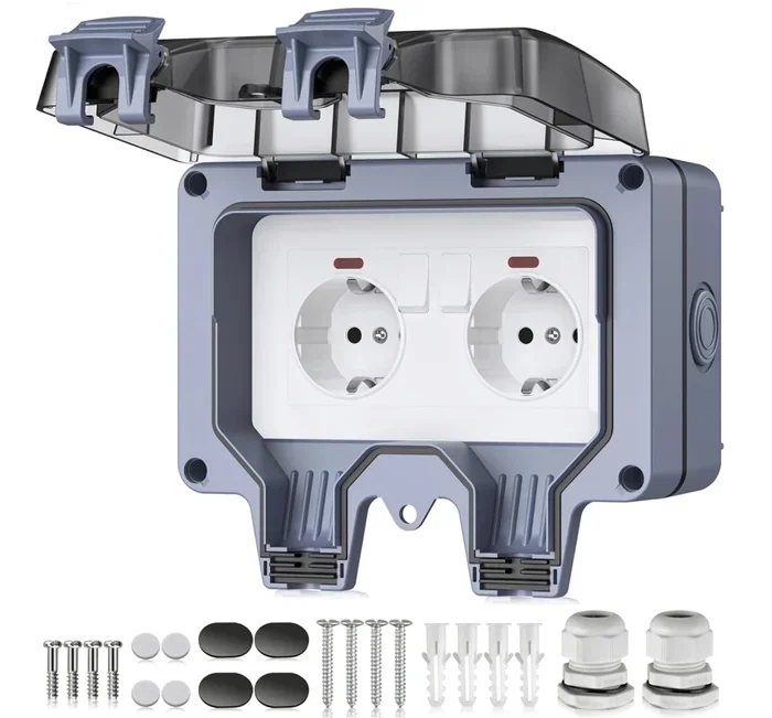 Двойная водонепроницаемая розетка IP66 с выключателями и индикацией. Стоит такая около 1400 рублей . Ссылка на неё