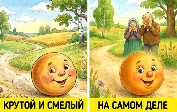 Детское восприятие Колобка меняется, когда понимаешь, что старики лепили его из последних запасов. Он укатился в поисках приключений, проявив эгоизм и не поблагодарив своих создателей.