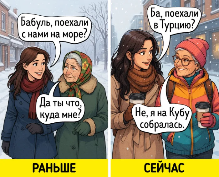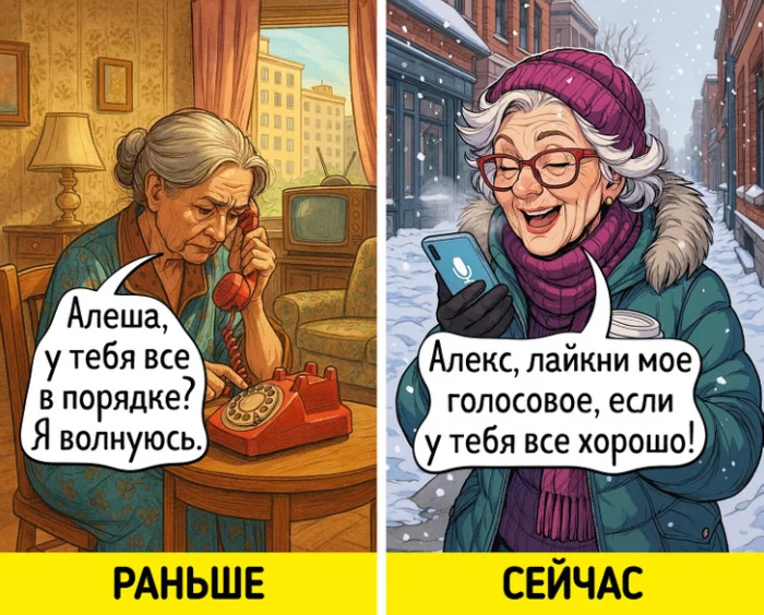 Раньше бабушки без труда запоминали имена всех персонажей любимых телесериалов, а дедушки моментально угадывали название трехбуквенной рыбы из семейства карповых. Сейчас же старшее поколение осваивает современные технологии: активно пользуется мессенджерами, снимает видеоролики и порой превосходит в этих навыках даже молодежь. Времена изменились — и наши родные старшего возраста изменились вместе с ними. В сотрудничестве с нейросетью мы создали серию комиксов, в которых с теплотой и юмором показаны узнаваемые моменты из жизни бабушек и дедушек в прошлом и настоящем.