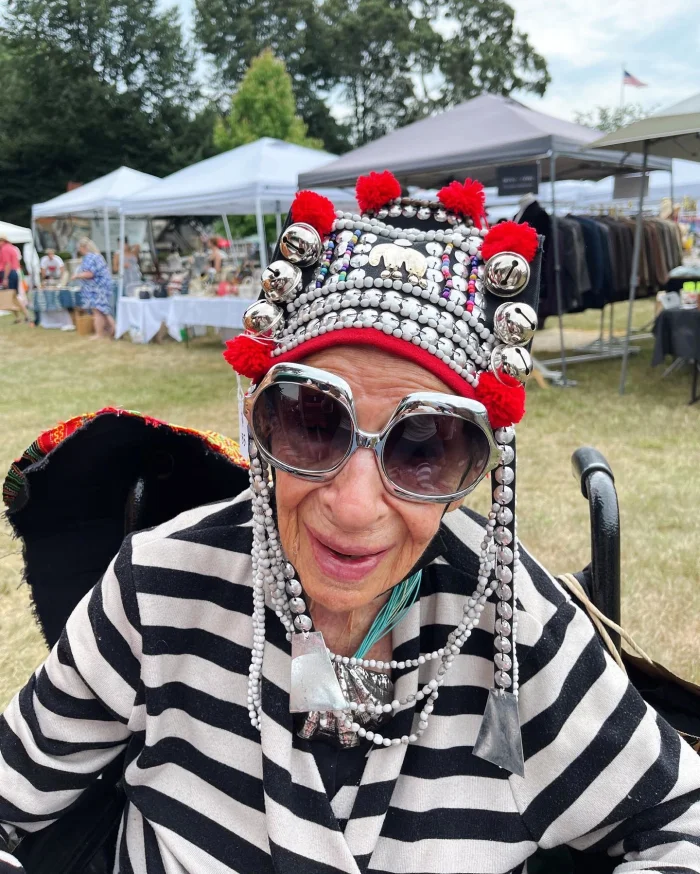 Её фирменный стиль поражает простотой и элегантностью: платиновые волны прически + гигантские очки-диоптрии + насыщенный коралловый акцент на губах + обильные слои винтажных украшений от ведущих дизайнеров. Этот узнаваемый лук превратился в её визитную карточку и философское заявление.