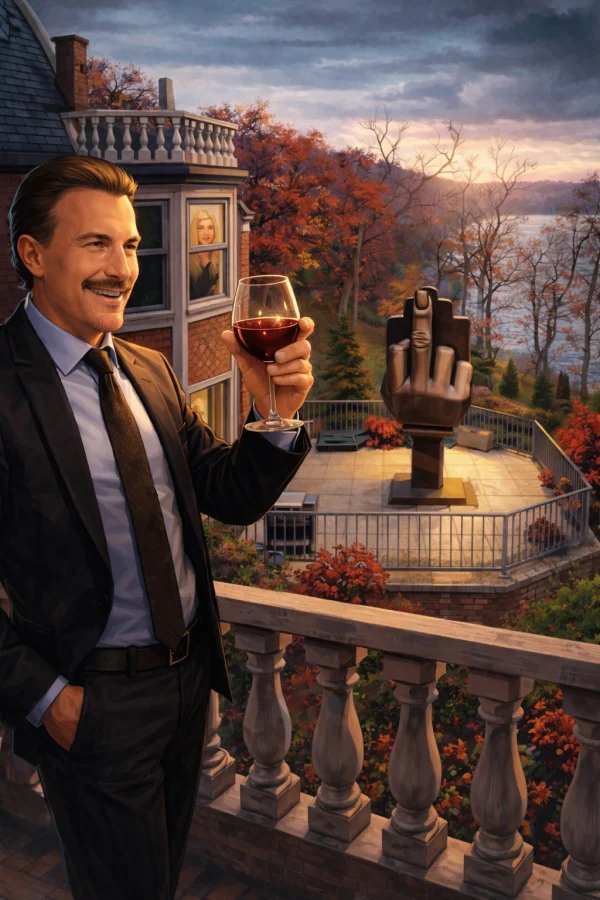 Однако на этом история не заканчивается. В центре участка он установил массивную статую в виде поднятого среднего пальца. Скульптура была выполнена из металла, имела внушительные размеры и, что самое главное, была направлена строго в сторону дома бывшей жены. По словам очевидцев, жест отлично просматривался как днём, так и ночью благодаря подсветке.