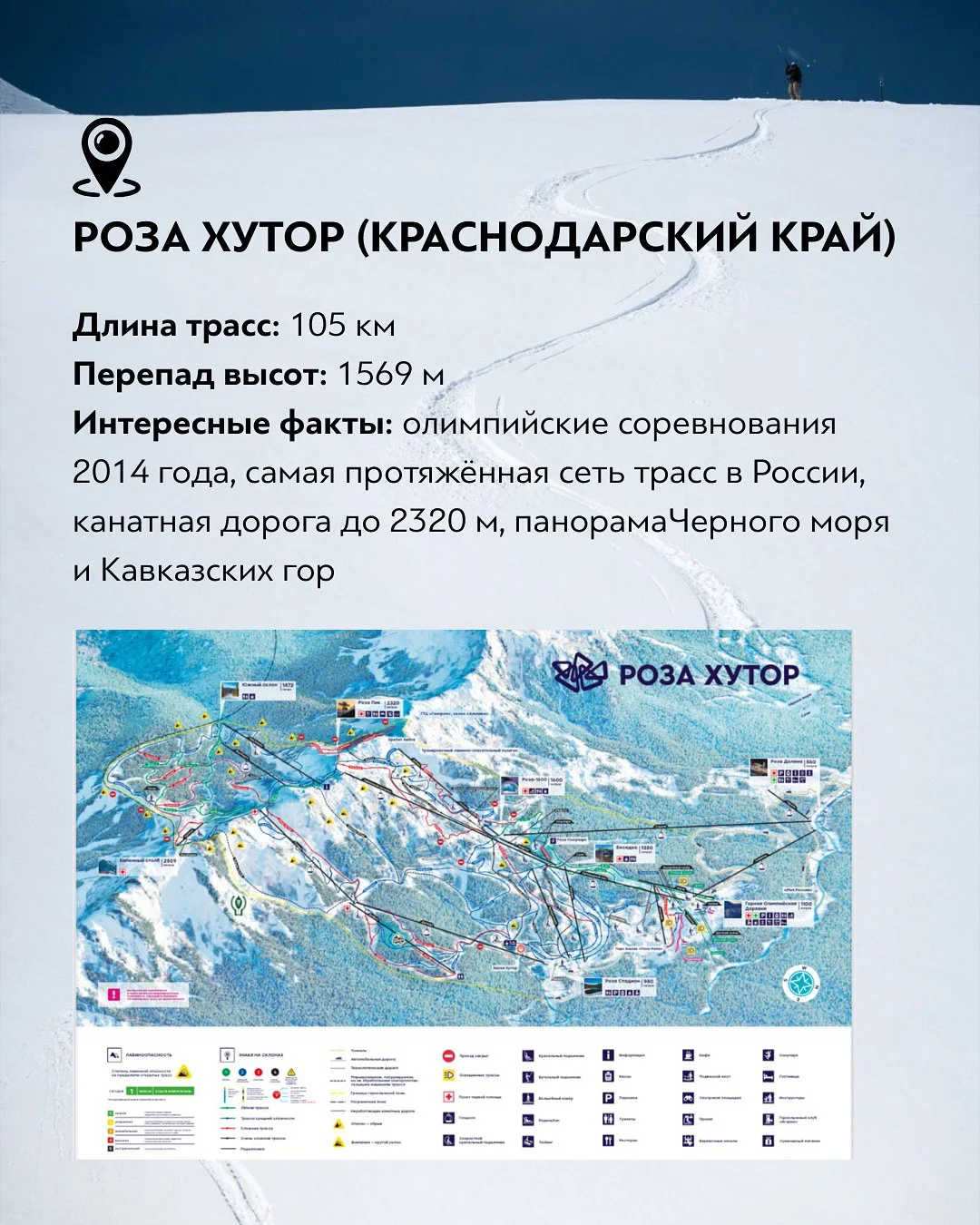 Роза Хутор в Краснодарском крае — крупнейший и самый современный горнолыжный курорт России. Общая протяжённость трасс превышает 105 км, а перепад высот составляет 1569 метров. Курорт был ключевой площадкой зимних Олимпийских игр 2014 года и до сих пор сохраняет олимпийский уровень сервиса. Канатные дороги поднимают гостей на высоту более 2300 метров, откуда открываются панорамы Кавказских гор и в ясную погоду даже Чёрного моря. Здесь представлены трассы всех уровней сложности, развитый après-ski и круглогодичная туристическая инфраструктура.