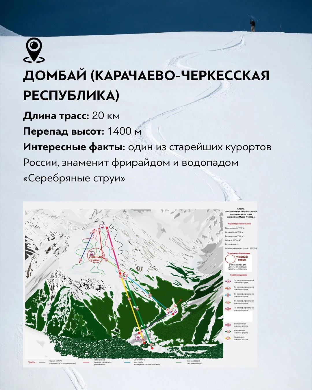 Домбай в Карачаево-Черкесии — один из старейших горнолыжных курортов России. Его трассы общей длиной около 20 км пролегают среди величественных кавказских вершин с перепадом высот до 1400 метров. Домбай особенно популярен у любителей фрирайда и дикой природы. Помимо катания, туристов привлекают водопады, в том числе знаменитые «Серебряные струи», и неповторимая атмосфера высокогорного курорта.