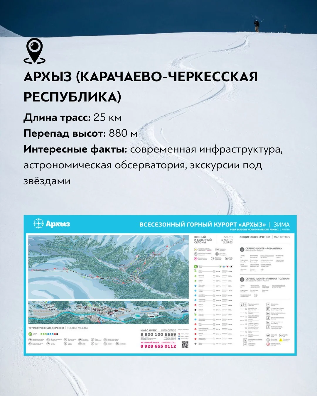 Архыз — относительно молодой, но стремительно развивающийся курорт в Карачаево-Черкесской республике. Длина трасс здесь достигает 25 км, перепад высот — около 880 метров. Архыз выделяется современной инфраструктурой, широкими трассами и удобными подъёмниками. Дополнительный интерес представляют экскурсии в астрономическую обсерваторию и ночные наблюдения за звёздным небом, благодаря чистому горному воздуху.