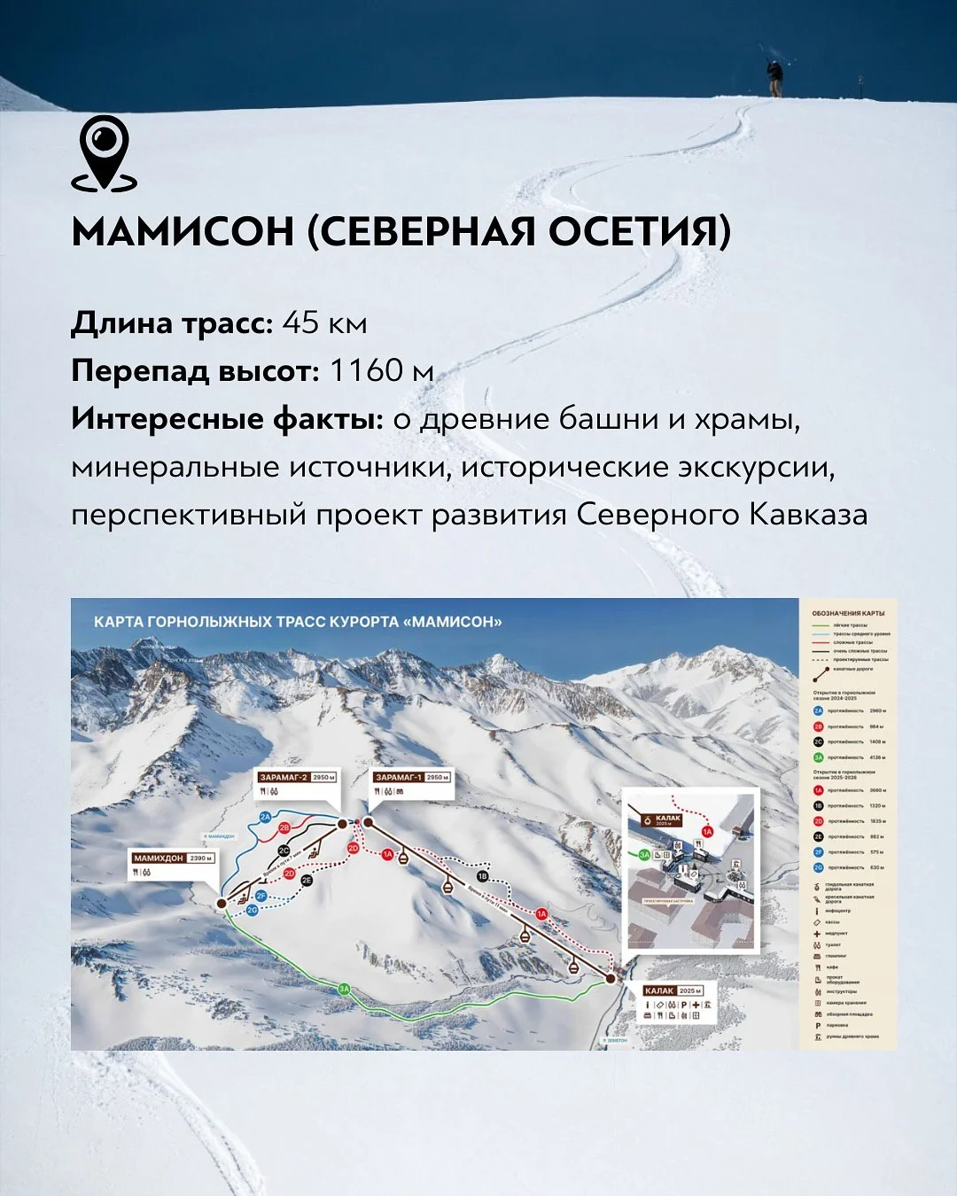 Мамисон в Северной Осетии — перспективный горнолыжный проект, который активно развивается. Протяжённость трасс достигает 45 км, перепад высот — около 1160 метров. Курорт расположен в живописном горном ущелье, богатом древними башнями, храмами и минеральными источниками. Мамисон сочетает катание с историческими и культурными экскурсиями и считается одним из ключевых туристических проектов Северного Кавказа.