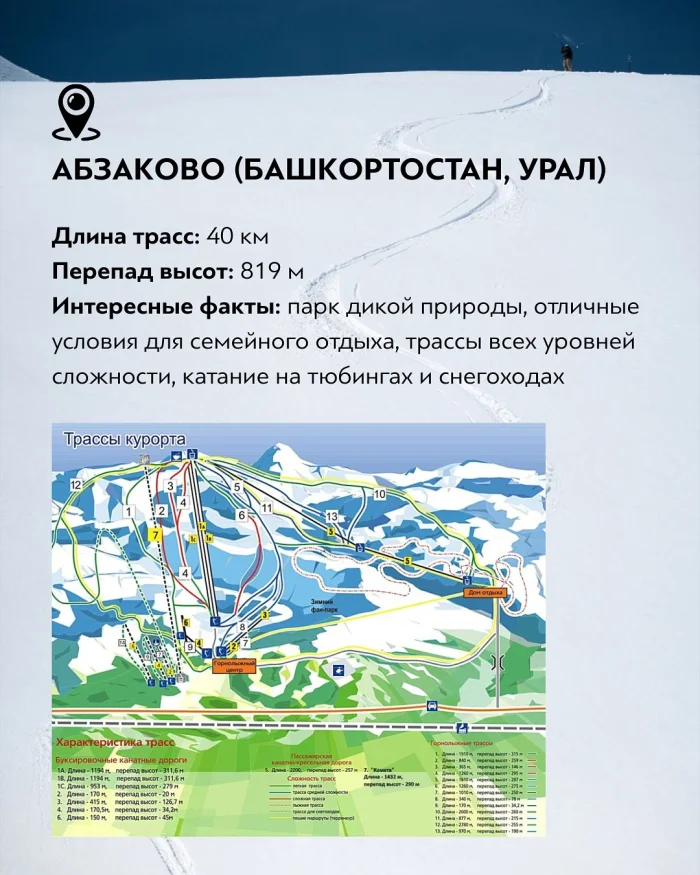 Абзаково, расположенное в Башкортостане на Южном Урале, давно считается одним из самых универсальных курортов России. Общая длина трасс здесь составляет около 40 км, а перепад высот — 819 метров. Курорт славится мягким климатом, живописными лесами и ухоженными склонами. Здесь есть трассы для новичков, уверенных лыжников и профессионалов, а также развитая инфраструктура для семейного отдыха. Помимо горных лыж, в Абзаково популярны тюбинг, катание на снегоходах и прогулки по природному парку.
