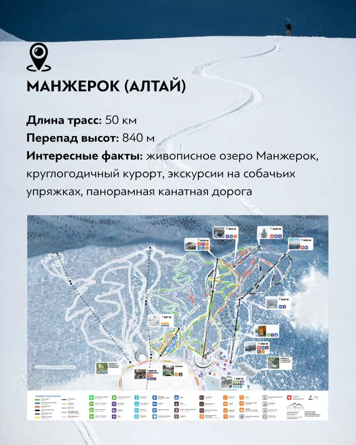 Манжерок на Алтае — всесезонный курорт с активно развивающейся инфраструктурой. Протяжённость трасс достигает 50 км, перепад высот — около 840 метров. Курорт расположен рядом с живописным озером Манжерок и предлагает не только горные лыжи, но и экскурсии, катание на собачьих упряжках и панорамную канатную дорогу с видами на Алтайские горы.