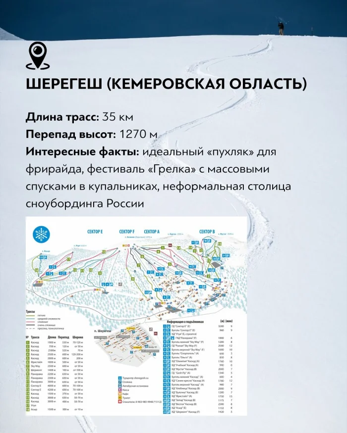Шерегеш в Кемеровской области — культовое место для любителей фрирайда и сноубординга. Общая длина трасс составляет около 35 км, перепад высот — 1270 метров. Курорт знаменит своим «пухляком», неформальной атмосферой и фестивалем «Грелка», где проходят массовые спуски в купальниках. Шерегеш по праву считается неофициальной столицей сноубординга России.