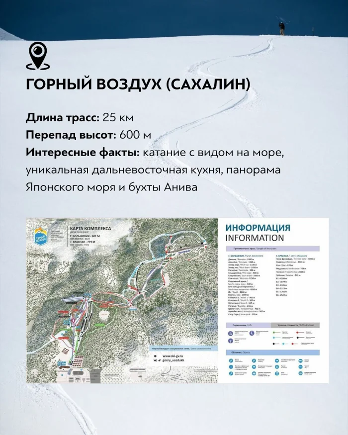 Горный Воздух на Сахалине — уникальный курорт с катанием практически у моря. Длина трасс около 25 км, перепад высот — 600 метров. Здесь можно кататься с видами на Японское море и бухту Анива, а после — познакомиться с дальневосточной кухней. Курорт популярен как у туристов, так и у профессиональных спортсменов.