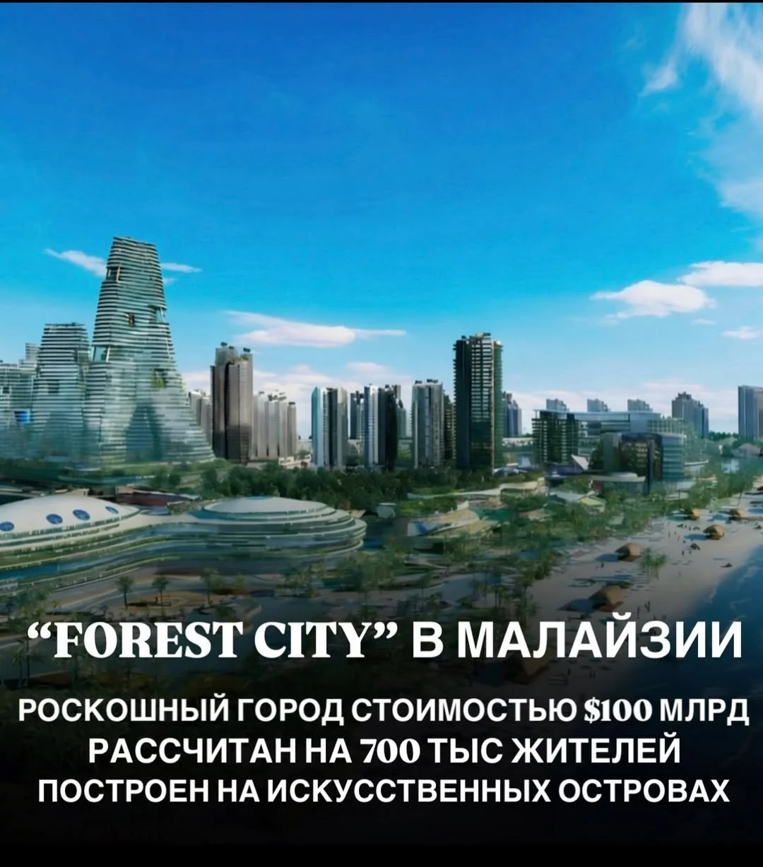 Малайзия решила построить город будущего прямо на искусственных островах. Forest City — это роскошный урбанистический комплекс стоимостью около 100 миллиардов долларов, рассчитанный на 700 тысяч жителей. Город задуман как экологичный и высокотехнологичный, с обилием зелени, умными системами управления и современной инфраструктурой. Несмотря на сложности с заселением, проект остается одним из самых амбициозных примеров современной градостроительной мысли.