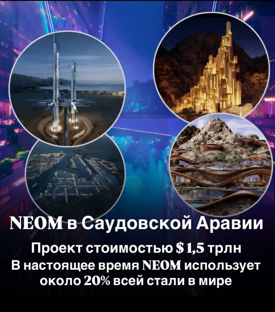 И, наконец, NEOM в Саудовской Аравии — один из самых дорогих проектов в истории человечества. Его общая стоимость оценивается в 1,5 триллиона долларов. Это не просто город, а целый регион будущего с инновационными технологиями, возобновляемой энергетикой, автономным транспортом и футуристической архитектурой. По некоторым оценкам, на строительство NEOM уже сейчас уходит около 20% всей производимой в мире стали.