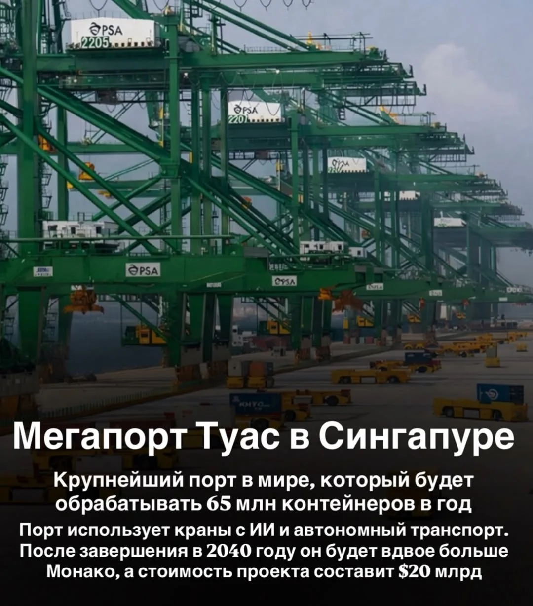 Не менее впечатляющим выглядит мегапорт Туас в Сингапуре. После полного завершения он станет крупнейшим портом в мире, способным обрабатывать до 65 миллионов контейнеров в год. Вся инфраструктура порта изначально проектируется как максимально автоматизированная: используются краны с элементами искусственного интеллекта и автономный транспорт без водителей. Общая стоимость проекта составляет около 20 миллиардов долларов, а к 2040 году порт будет по площади примерно вдвое больше Монако, окончательно закрепив за Сингапуром статус одного из главных логистических хабов планеты.