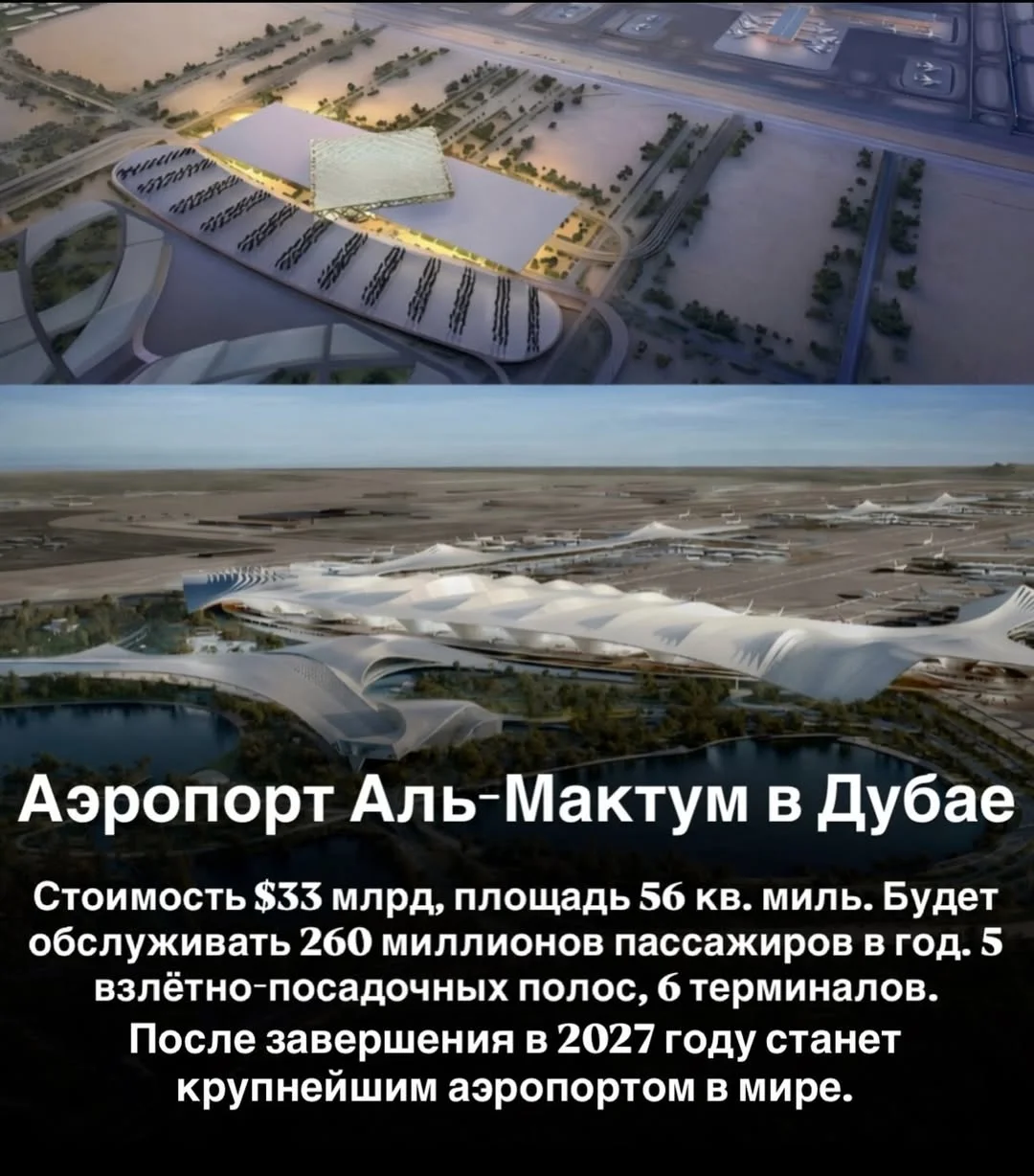 В Дубае полным ходом идёт развитие аэропорта Аль-Мактум, который после завершения станет крупнейшим аэропортом в мире. Проект стоимостью 33 миллиарда долларов занимает площадь около 56 квадратных миль. Аэропорт сможет обслуживать до 260 миллионов пассажиров в год, будет иметь пять взлётно-посадочных полос и шесть терминалов. Его запуск запланирован на 2027 год, и он станет новым глобальным центром авиационных перевозок, сместив акценты мировой логистики.