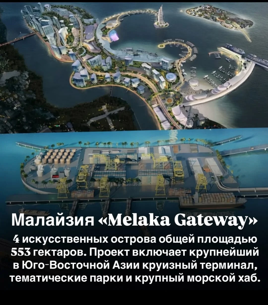 Малайзия также делает ставку на масштабное освоение прибрежных территорий. Проект Melaka Gateway предполагает создание четырёх искусственных островов общей площадью 553 гектара. Здесь разместятся крупнейший в Юго-Восточной Азии круизный терминал, тематические парки, жилые и коммерческие зоны, а также крупный морской хаб. Проект задуман как новый туристический и торговый центр региона, способный конкурировать с крупнейшими портовыми городами Азии.