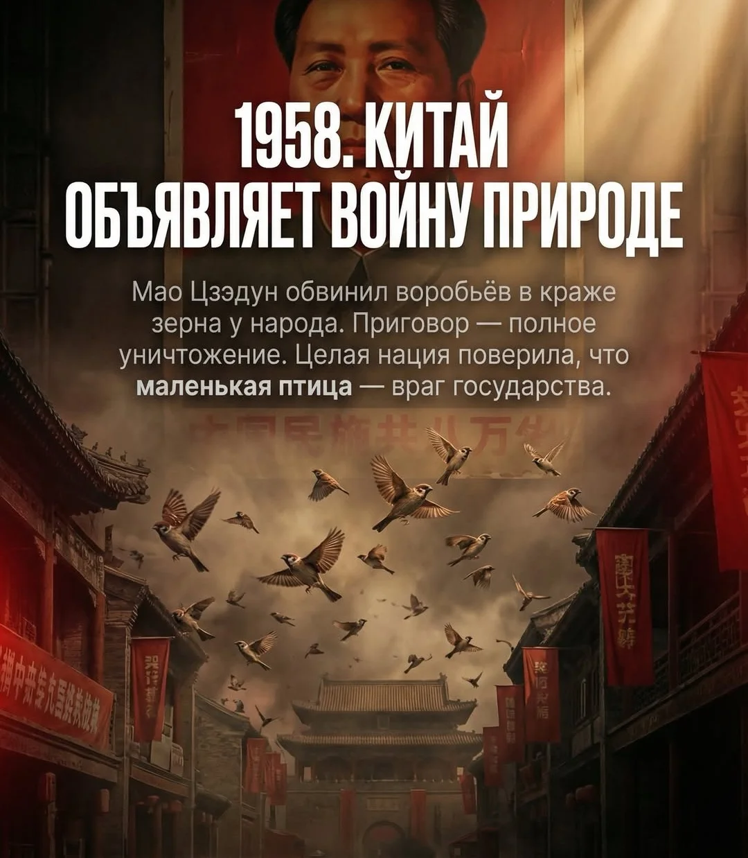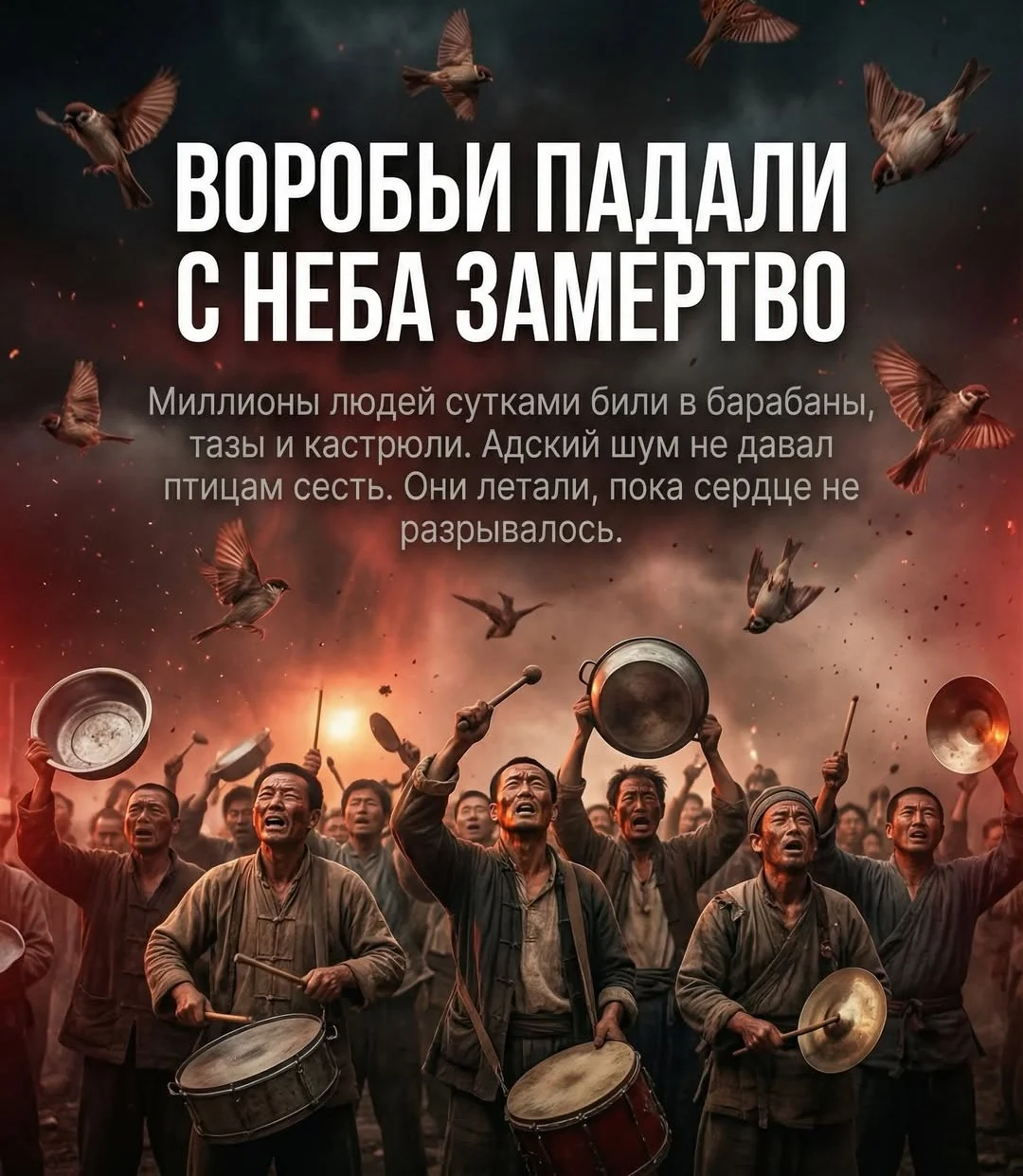 Причины были комплексными: неудачные реформы, завышенные планы по сдаче зерна, управленческие ошибки, климатические проблемы. Но кампания по уничтожению воробьёв стала символом того, как вмешательство в природный баланс может привести к непредсказуемым последствиям