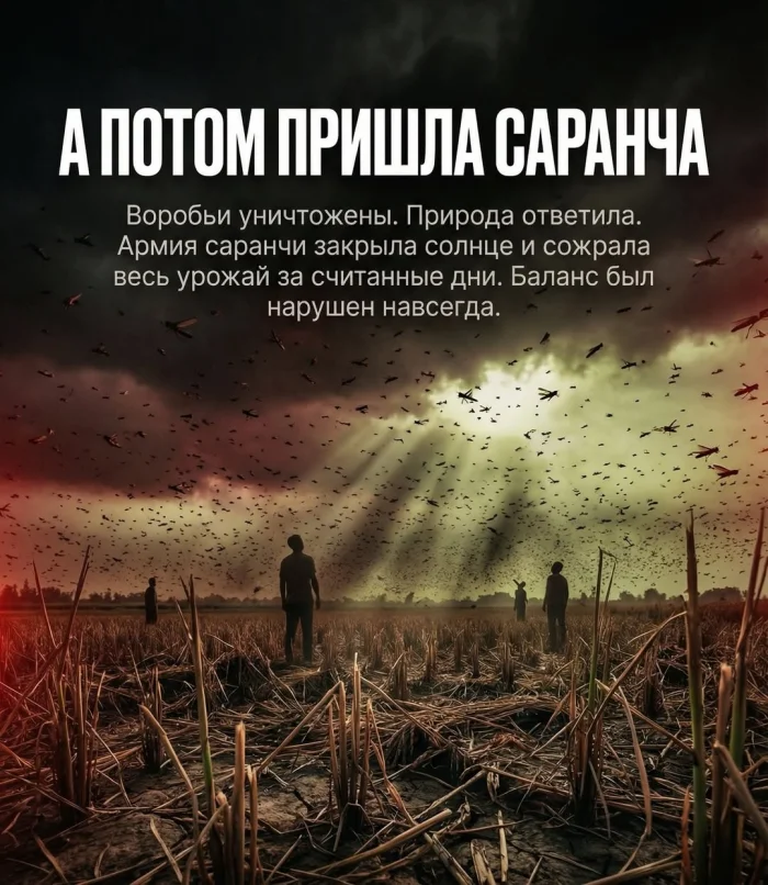 Вскоре страну накрыли нашествия саранчи. Поля уничтожались за считанные дни. Урожаи резко сократились. Экосистема, лишённая одного из своих звеньев, дала сбой.