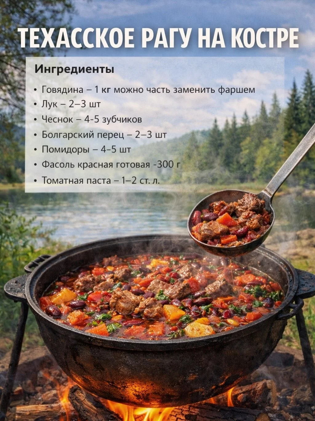 Если хочется чего-то более «западного», но не менее насыщенного — техасское рагу отлично подойдёт. Это густое, ароматное блюдо с мясом, фасолью и овощами, которое буквально создано для открытого огня.