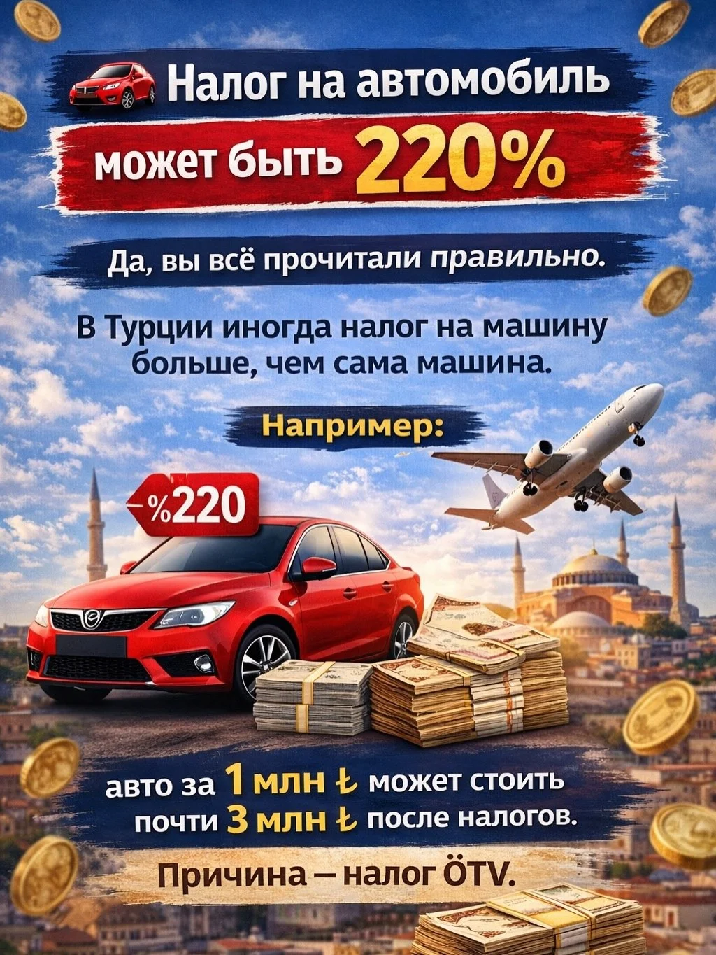 Не менее впечатляет ситуация с автомобилями. В Турции действует специальный налог ÖTV, который может достигать 220%. Да, это не ошибка. В некоторых случаях налог оказывается выше стоимости самой машины.