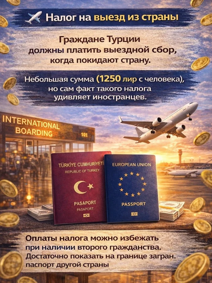 Ещё один неожиданный налог — на выезд из страны. Граждане Турции обязаны платить специальный сбор при пересечении границы. В 2026 году он составляет около 1250 лир с человека.