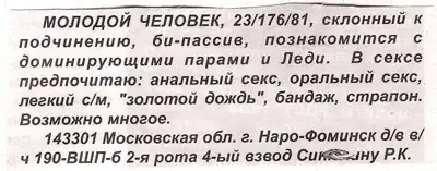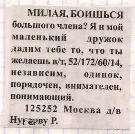 Вот это прикол. Я знаю, что поститутция широко распространена в пределах нашей родины, но чтоб вот такие объявы давать - жесть. За посты 5