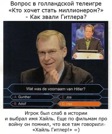 Тут кто-то заявил, что они не обязаны это знать. Мля, ок. А зачем мы учим историю зарубежную? Для общего минимального развития. А Гитлер и его "деятельность" затронули всю планету в той или иной степени. Никто не обязывает помнить дату битвы под Сталинградом, но имя того, кто начал эту заваруху, надо бы помнить.