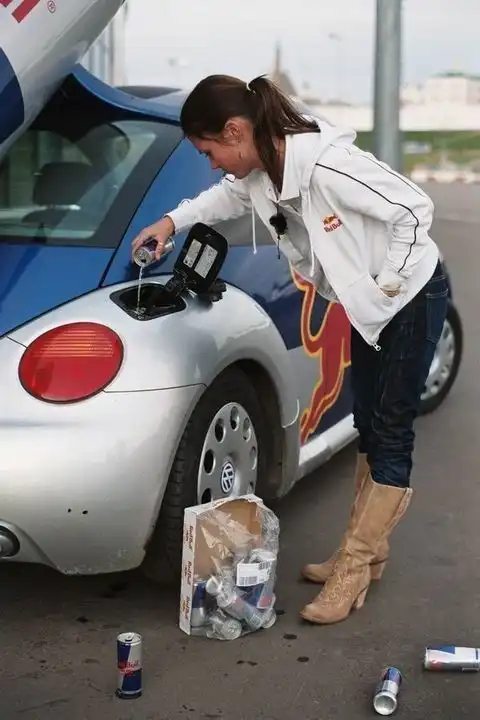 такое ощущене,что она решила,раз на этой машине нарисован рэд бул,то и заправлять ее надо этим напитком.