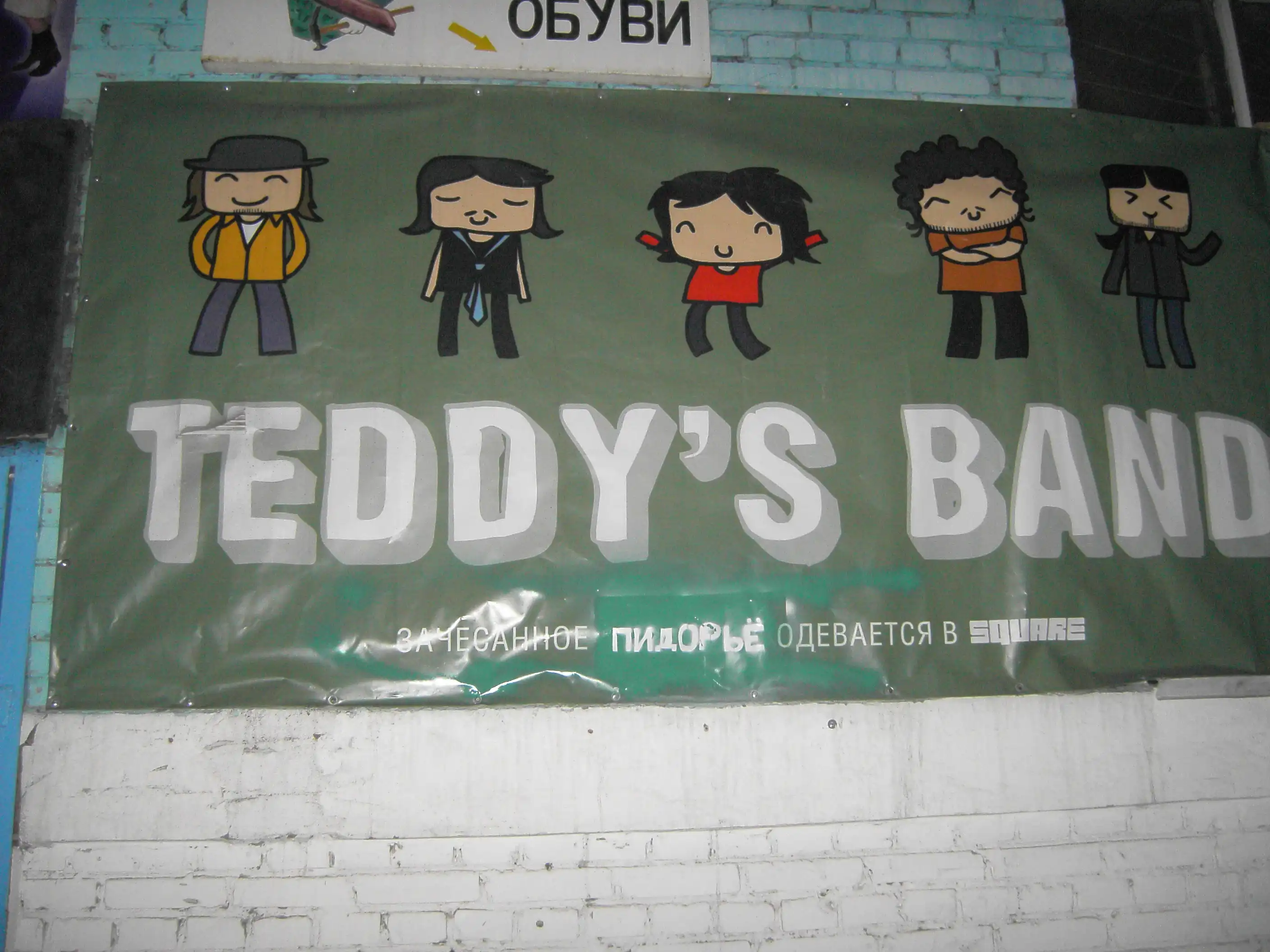 Скорее всего "гопниками" нужно назвать зачуханчцев волосатых, которых даже в Советском союзе дрюкали и принудительно брили. Вот купил себе нормальный пацан одежду в этом *банном магазине Teddy's Band, затем отростил волосы и все, он стал вести себя как зачуханец и выглядеть также. Пацаны с поста просто на плакате правду написали, типо предеостережение: не хочешь педиком быть или зачуханцем не одевайся в этом магазине. Уважаю таких реальных пацанов, они герои России! Фарту и семок вам пацаны