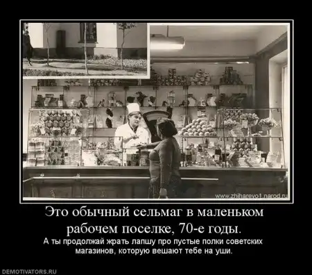 Ну про сельмаг в 70-ые я не согласен т.к. про дефицит и очереди мне родители и бабушки рассказывали, а им я верю побольше, чем демотиваторам.