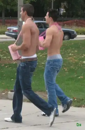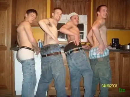 Эту сцену я бы назвал "проверка на модность". Пацаны проверяют у кого самые "модные", т. е. сексуальные трусы. Да и правильно было сказано, что эта "мода" пришла из тюрем. Но непонятно, зачем всё таки демонстрировать трусы, натянутые выше штанов. Одно дело "проверка на модность" - развлечение озабоченных подростков, а другое когда это делают вменяемые вроде мужики и бабы. Ну на этот вопрос мог бы ответить дедушка Фрейд. А мне кажется, что это прям фетишизм какой-то. Ходили бы в трусах. Не хрен штаны таскать.