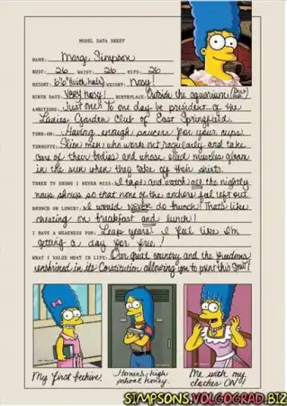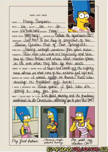 Мардж — единственный член в семье Симпсонов, добровольно посещающая церковь. Женщина поддерживает нравственность не только семьи, но и всего города. Ни для кого не секрет: она тратит на продукты всего 12 долларов в неделю (какая экономная!). Как результат - великолепная фигура, рассмотреть которую смогут все желающие на страницах «Плейбоя»!