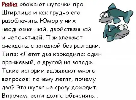 про рыб полная хрень ! летят 2 крокодила - 1-оранжевый, а другой - на запад ухахаахах пздц ;(