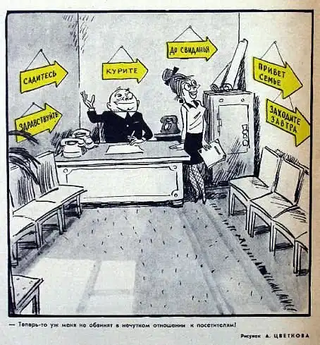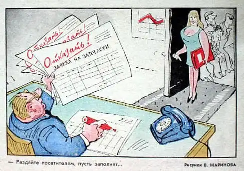 Это вот так в СССР высмеивалась бюрократия, тогда как на 300 млн. жителей приходиось 2,5 миллиона управленцев. В нашей современной и продвинутой России на 138 млн. жителей приходится 5,5 млн. управленцев... Что называется прочувствуйте разницу.