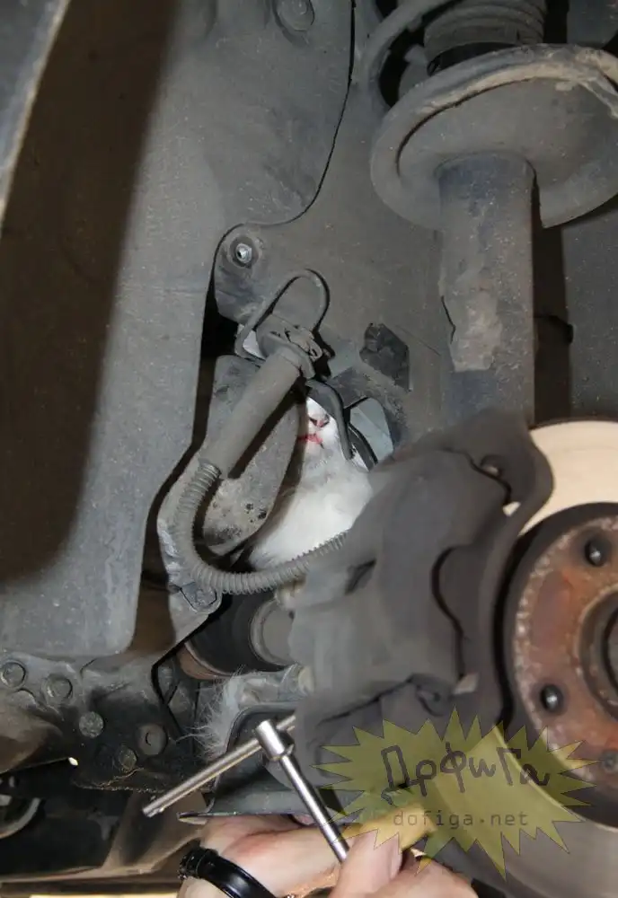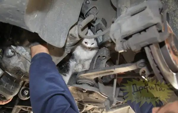 Подняв на подъемнике машину, "обалдевшие" работники сразу обнаружили мяукающую неисправность. Но устранить неполадку, вернее достать кота оказалось не так просто. Работникам пришлось изрядно попотеть, чтобы вызволить бедолагу. Кстати этим бедолагой оказался кот, живущий на заправочной станции.