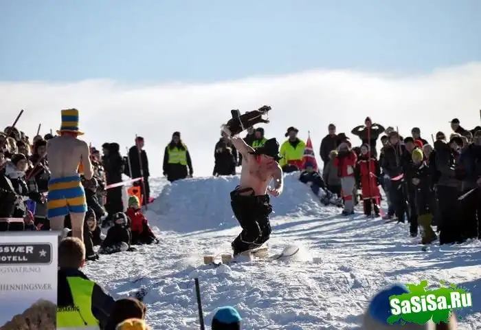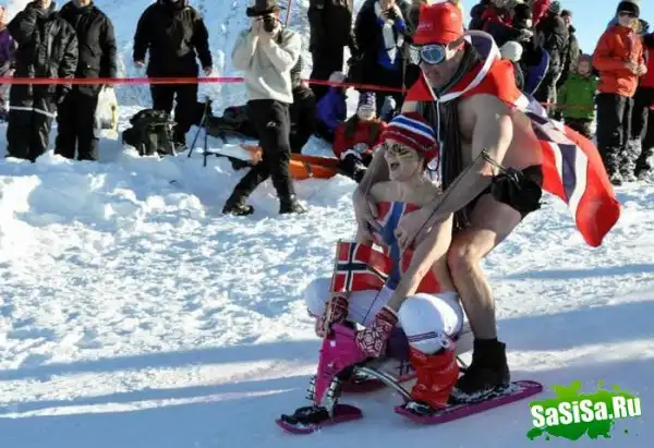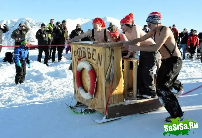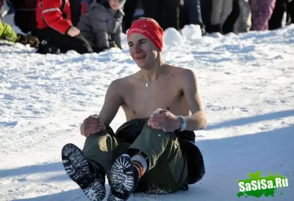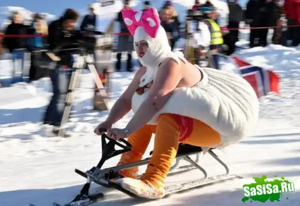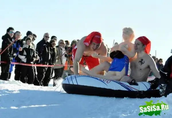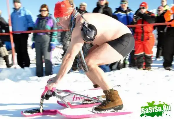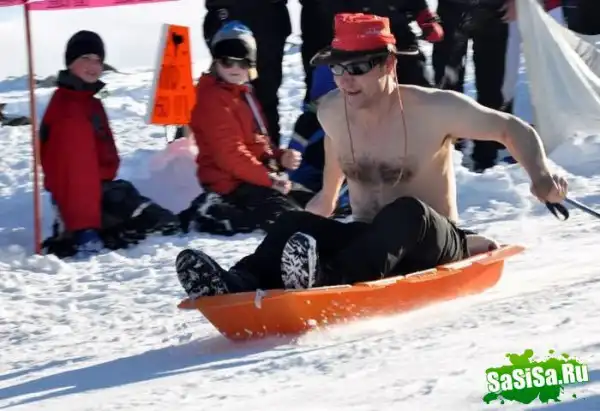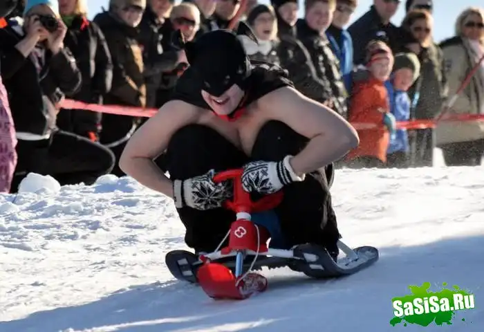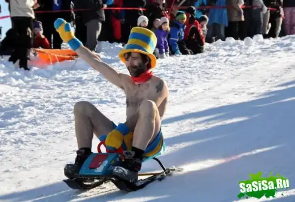 Для спуска со снежной горы использовались разные предметы: тазики, ванночки, даже надувные куклы. В общем гонка получилась сумасшедшая.