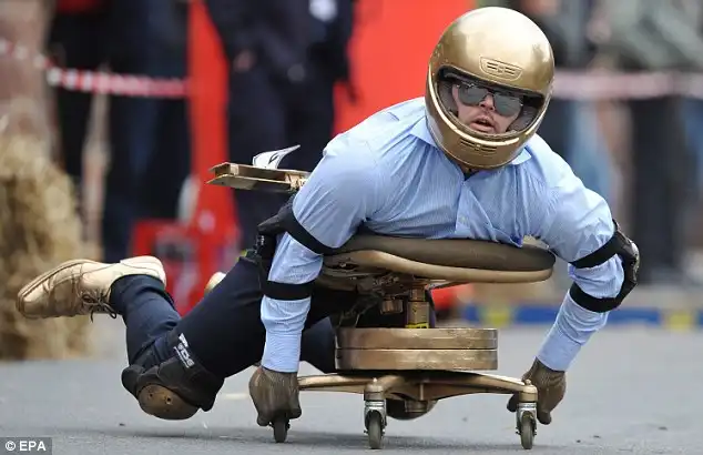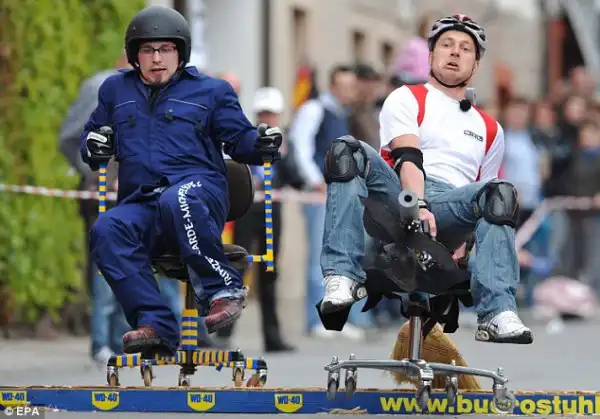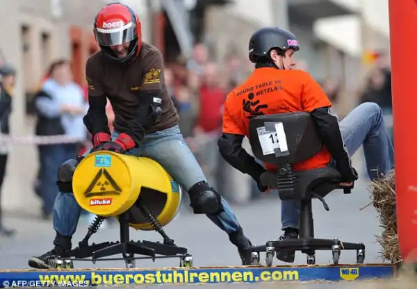 На снимках изображена группа молодых людей, наслаждающихся своим каждым рабочим днём. 58 конкурентов, едущих со скоростью 22 мили в час (примерно 10 м/с) состязаются друг с другом, пока город спит. Самое интересное, что гонка проходит на офисных креслах. Кстати, это уже третий такой "чемпионат". Pierre Feller из Люксембурга получил титул чемпиона, завершив 183- метровый спуск всего за 26,95 секунды. Второе и третье место заняли Andreas Ripper and Finn-Jan Rucktäschel. Самый запоминающийся стул принадлежал Heiko Winter, а сам он был одет как ковбой.