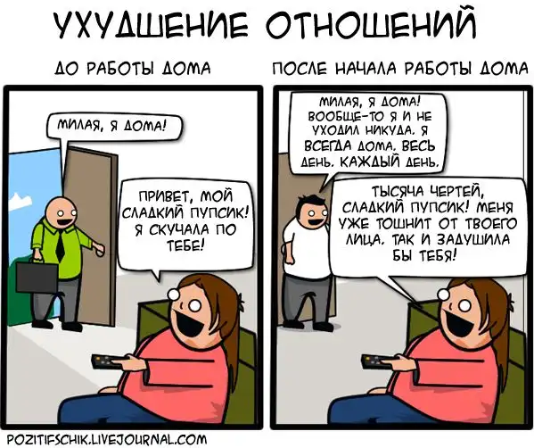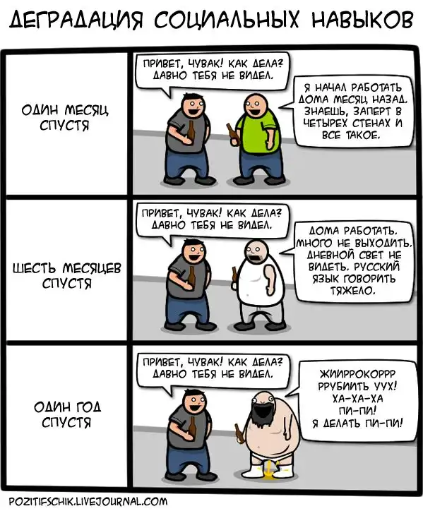 ага, я дома целый год проработал на себя дизайнером, Плюсов в профессиональном плане много, а вот в социальном пипец полный!!! Отвыкаешь от общества и живого общения, Потом ходишь не в теме, как на картинке шесть месяцев спустя..)))) Лучше - всего в достатке и профессионально работать на работе.
